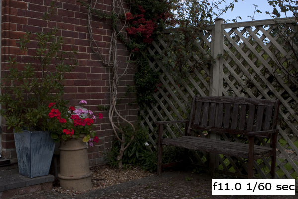 Zooming into the red flowers on the left it can be seen that the red flowers are washed out and the pink flowers clipped with no distinction or border within the petals or background. The image at -1 stop has this area of the image perfectly exposed with ideal saturation and distinction.